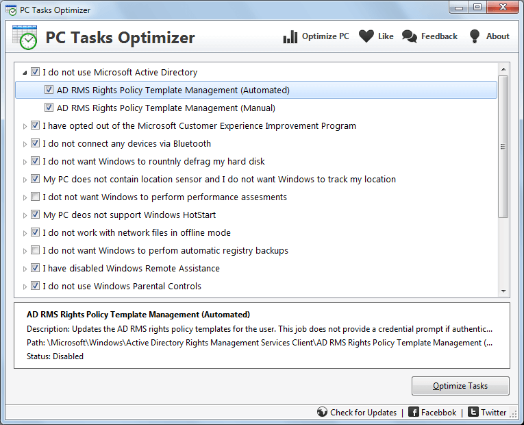 By using simple, clear and easy to understand options, PC Tasks Optimizer offers intuitive way to tweak dozens of unnecessary Windows scheduled tasks with a mouse click, separating you from technical terms and complexities related to Windows operating system scheduled tasks. This makes PC Tasks Optimizer ideal for novices who have no or little computing knowledge.