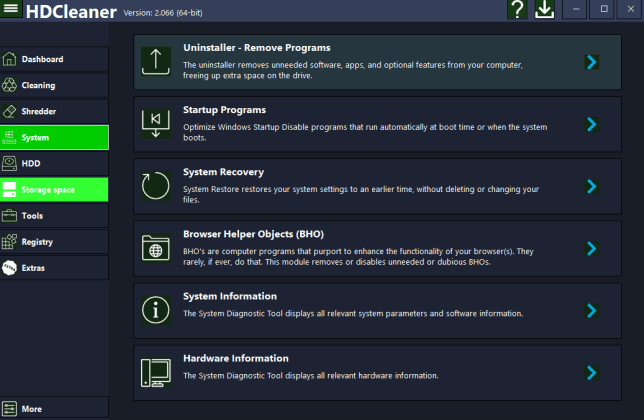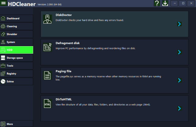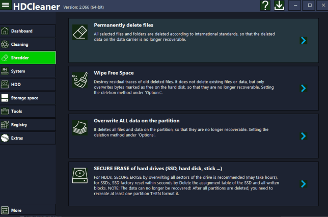 HDCleaner offers a comprehensive suite of programs for Windows system maintenance. Whether you want to declutter your hard drive, clean the registry, encrypt data, remove user traces, completely back up the registry, defragment it, or perform a quick scan – you'll always find the right tool in the clearly arranged "toolbox." With one-click optimization, the application organizes and cleans the registry, destroys internet traces, removes temporary files, defragments the registry, finds hard drive errors, and optimizes system startup. Optimized for use with solid-state drives (SSD) and hard disk drives (HDD).