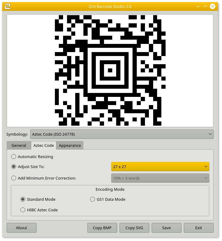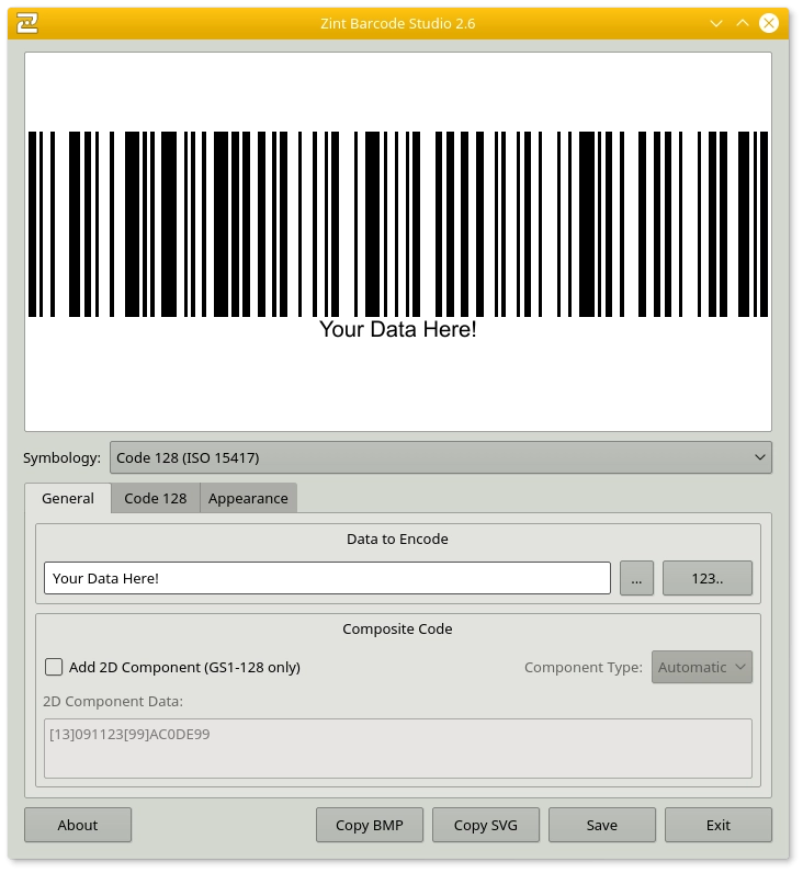 Automated ECI switching to support all Unicode characters and automated FNC1 character insertion in GS1 mode. Save to PNG, BMP, TIF, GIF, PCX, SVG, WMF and EPS. Includes CLI, GUI and API for calling from other applications.