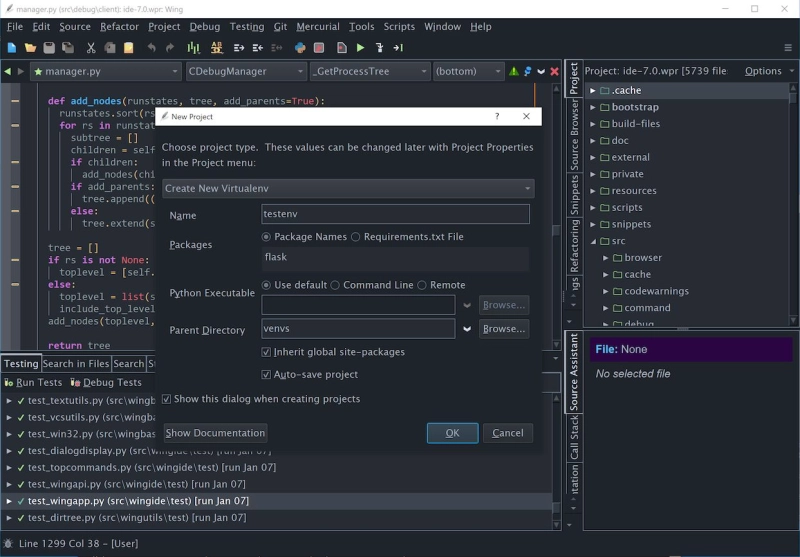 Wing Python IDE is a full-featured Python IDE designed for professional developers. It includes powerful editing, code intelligence, refactoring, debugging, search, unit testing, project management, revision control, and remote development features.