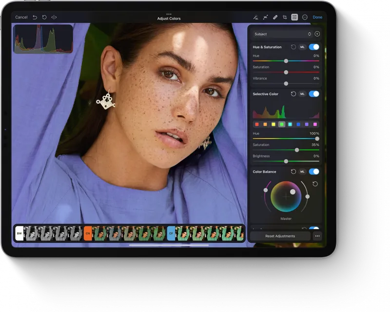 Photomator is designed from the ground up to build upon your Photos library. When you edit photos, changes sync with the Photos app automatically, your edits are nondestructively preserved by Photomator, and everything just works. But you can also easily edit images elsewhere on your device and even external locations like iCloud Drive and USB drives.
