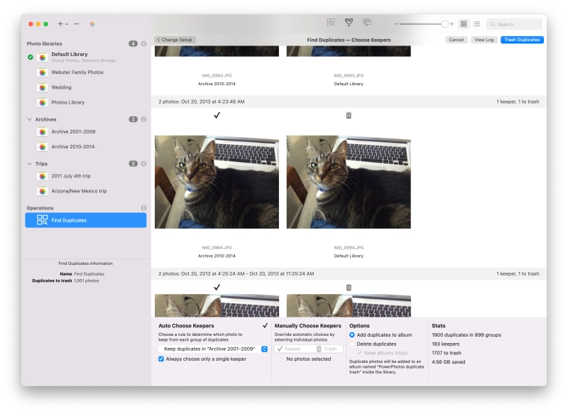 It’s easy to have multiple copies of the same photo creep into your photo collection over time. Use PowerPhotos to find duplicate photos in one or more libraries, view them side by side, and delete the extra copies to save space on your drive and in iCloud.