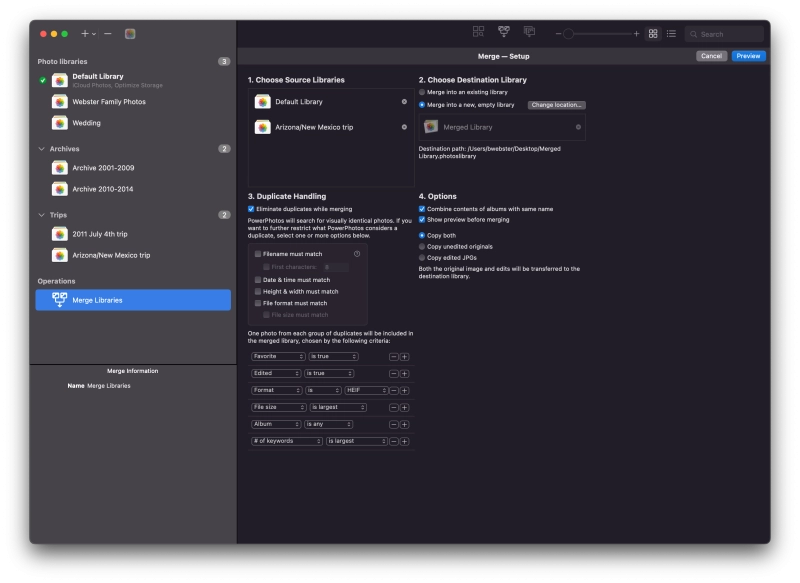 Got a whole bunch of libraries you want to consolidate into one? PowerPhotos lets you merge your libraries together while weeding out duplicate photos in the process and keeping albums and photo edits/metadata intact. You will be shown a preview of what your merged library will look like before any modifications are done, to ensure your merged library looks how you want.
