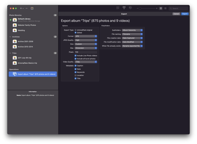 PowerPhotos 2.0 has a new export feature that offers more options not found in Photos built-in exporting capabilities. In addition to standard features such as including metadata in the exported photos and videos and being able to export in different formats and sizes, PowerPhotos also allows you to export albums from your library as a hierarchy of folders in the Finder that mimic your album hierarchy. You can also set the Finder modification/creation dates to match the photo EXIF date, customize file naming, include videos from Live Photos, and more.