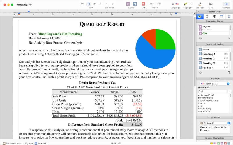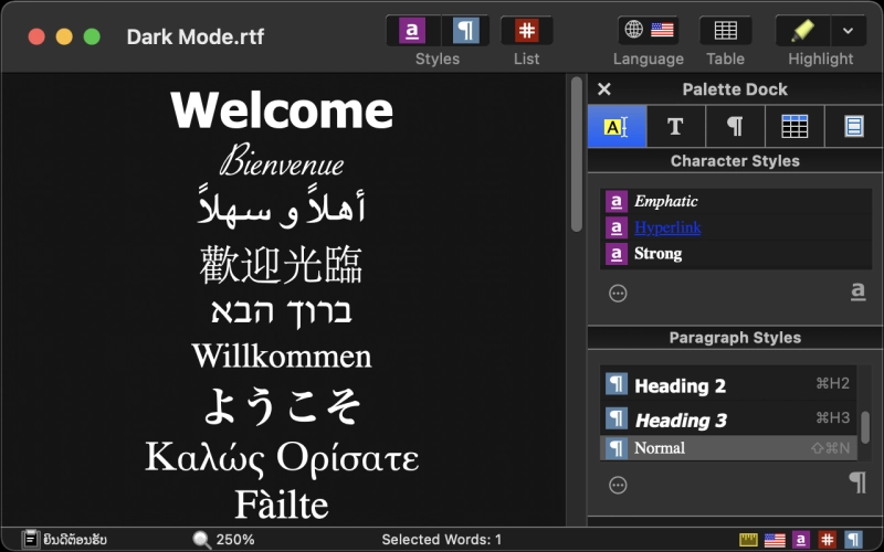 When you need to refine your documents, the tools you need are ready. Intuitive style sheets help you create beautiful documents quickly. Our powerful Find and Replace (with regular expressions) will help you polish and clean your text. Sharing your work is easy with numerous file formats like RTF (rich text format), PDF, and Word (.doc,.docx).