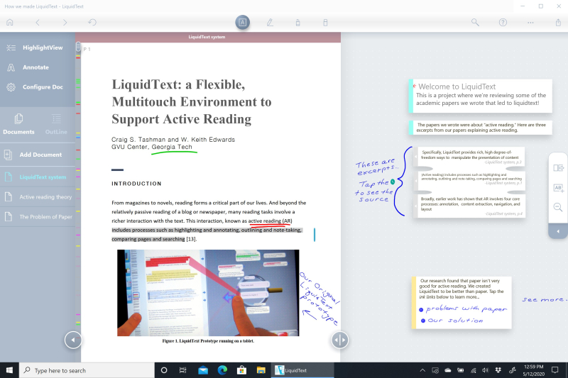 LiquidText offers a fast, natural way to review, gather, and organize information across all your documents and webpages—then apply the results to writing reports, meeting prep, or simply studying. Pull out key facts and connect them together, squeeze a document to compare sections, draw a line to connect ideas in different documents, comment on multiple pages at once, build upon your thoughts, and much more.