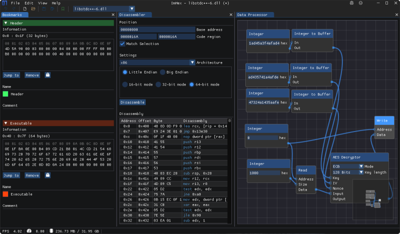 What makes ImHex special is that it has many advanced features that can often only be found in paid applications. Such features are a completely custom binary template and pattern language to decode and highlight structures in the data, a graphical node-based data processor to pre-process values before they're displayed, a disassembler, diffing support, bookmarks and much much more. At the same time ImHex is completely free and open source under the GPLv2 license.