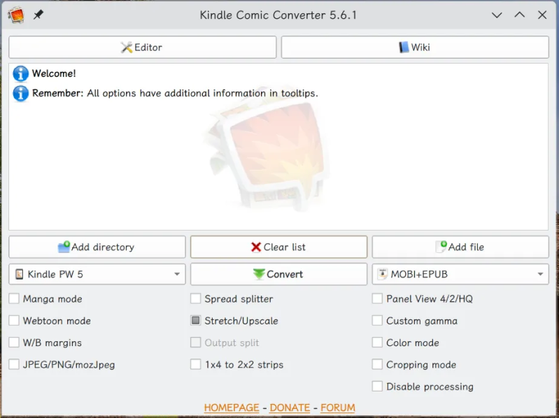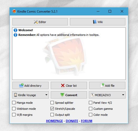 Kindle Comic Converter optimizes black & white (or color) comics and manga for E-ink ereaders like Kindle, Kobo, ReMarkable, and more. Pages display in fullscreen without margins, with proper fixed layout support. Supported input formats include JPG/PNG image files in folders, archives, or PDFs. Supported output formats include MOBI/AZW3, EPUB, KEPUB, CBZ, and PDF.