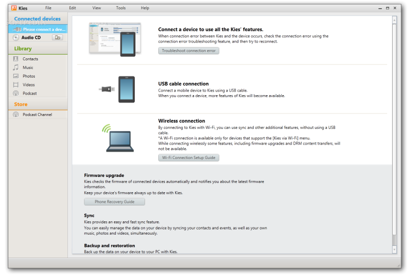 Kies makes it simple to transfer media files, play content, and music between your mobile device and a browser on the same wireless network. Kies keeps your device firmware updated whenever you connect, and includes personal information management software to help manage private data such as contacts brought over through Microsoft Outlook. When connected, Kies automatically notifies you of new firmware version. Add and edit contact of mobile on Kies conveniently and sync contacts with those of Outlook, Google, or Yahoo.