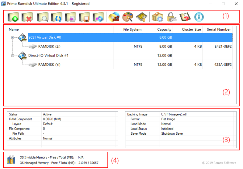 In addition, Primo Ramdisk offers unique features to effectively and efficiently manage system memory. It is able to dynamically allocate or release system memory for ramdisks, making better use of memory. Primo Ramdisk also implements the Unified Invisible Memory Management Interface (UIMMI) to create ramdisks from Invisible Memory, thereby overcoming the Windows limits on amount of system memory and allowing all installed physical memory to be fully utilized.