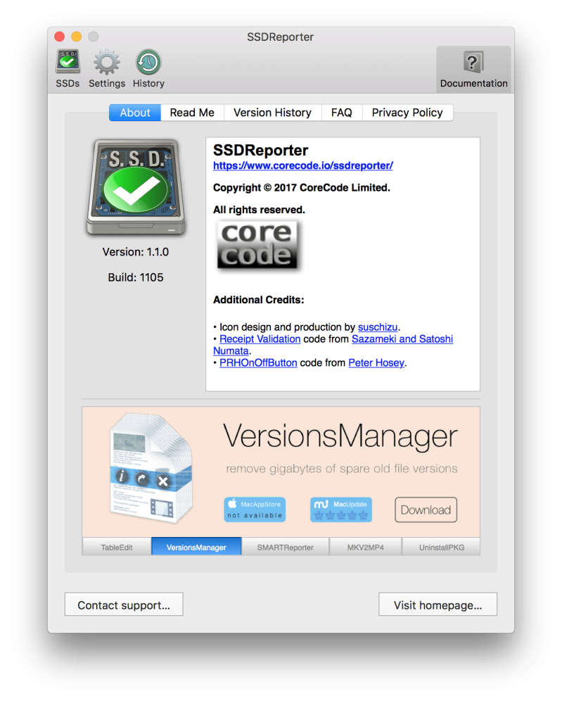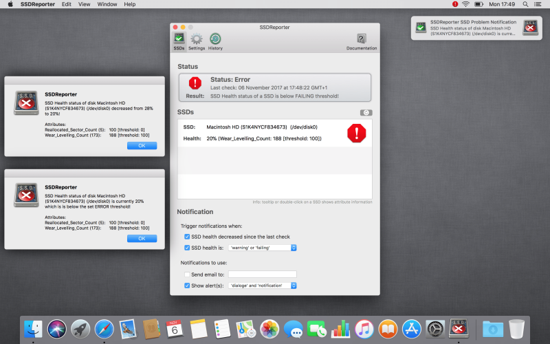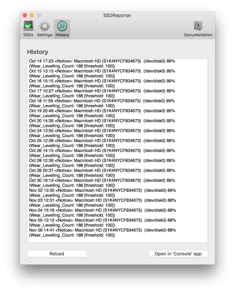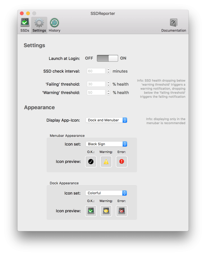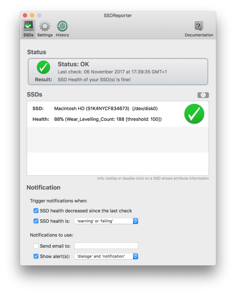 SSDReporter is an application that checks the health of your internal Solid State Disks ("SSD" aka "Flash Storage"). Since SSDs have a limited life-time determined by the number of write operations it is important to keep an eye on your SSD status. SSDReporter can warn you by e-mail or on-screen each time the health of your SSD decreases and/or when the health falls below the 'warning' or 'error' thresholds. The current status of your SSDs is also always easily recognizable because SSDReporter changes its icon (optionally in the menubar) from green to yellow (warning threshold) and finally red (error threshold) as the SSD health decreases.