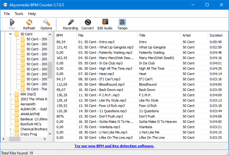 BPM Counter is a fast and accurate beats per minute detector for MP3 music. It may be helpful for DJs who need to get information about entire music collection quickly and for any kind of remixing/sampling stuff. Don't waste your time for manual tapping, just navigate to any folder with music and BPM Counter will show all compatible audio files (MP3 and WAV) and start BPM detection automatically. A common mistake with other BPM detectors is they may halve or double the actual BPM rate because decoder MP3 files partialy with lower quality. We use high-quality audio decoders from Audio Converter Plus to guarantee balance between performance and accuracy.